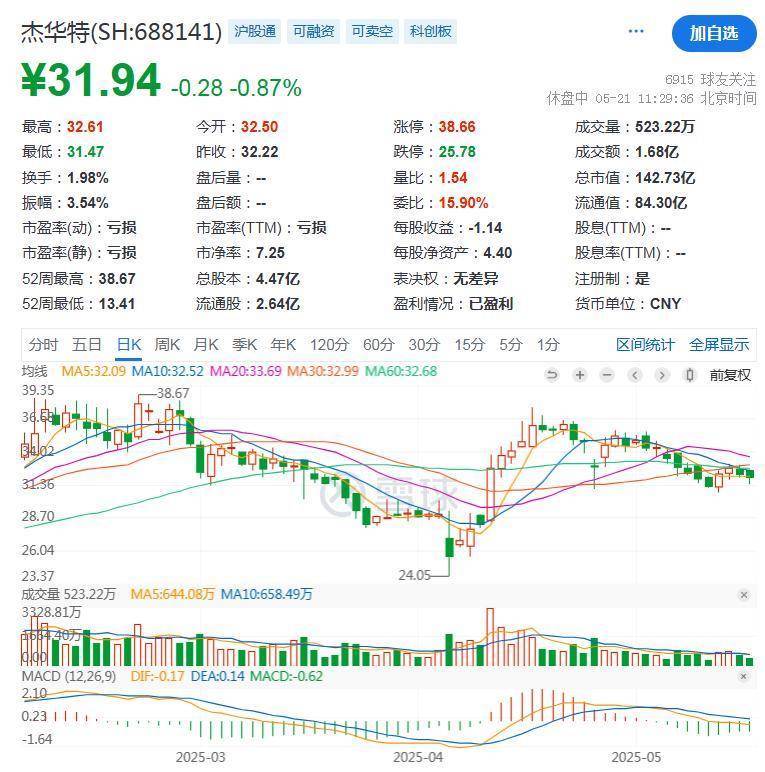 二级市场上,截至21日午间收盘,杰华特下跌0.87%报31.94元/股,最新市值142.73亿元,公司股价和一年多前的高位相比已跌超四成,2023年4月至今长期处于破发状态。
