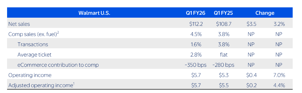 全球电商增长22%,主要受店内提货、配送和第三方平台的推动,电商对美国区可比销售的贡献率达到约350个基点。美国市场可比销售额增长4.5%,这主要得益于健康及保健和杂货的强劲增长。Sam's Club同店销售增长6.7%,交易量增长4.8%。会员收入增长9.6%,会员数量、续约率和Plus会员均实现稳健增长。全球广告收入增长50%(包括新收购的VIZIO),美国本土的Walmart Connect广告业务增长31%(不含VIZIO)。沃尔玛维持了2026财年的年度销售和利润预测不变。公司继续预计截至2026年1月的财年调整后每股收益在2.50美元至2.60美元之间,年销售额增长在3%至4%之间。同时,预计第二季度合并净销售额增长在3.5%至4.5%之间,高于市场预期的3.46%。