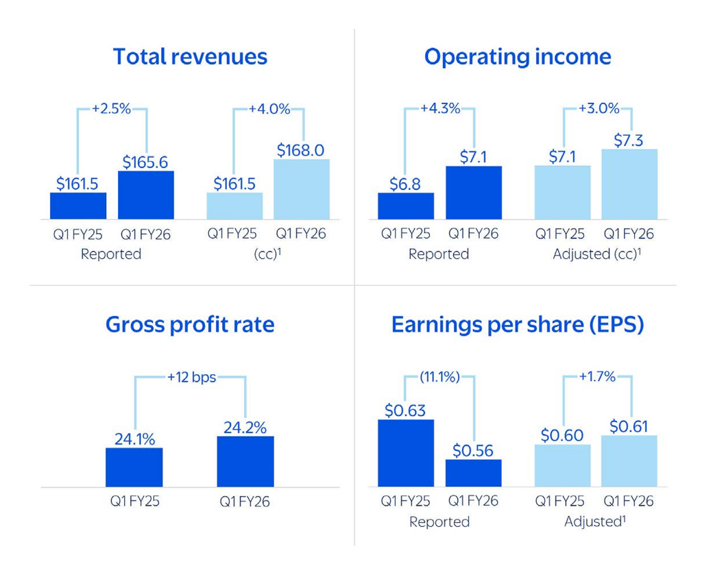沃尔玛一季度净销售额1656亿美元,同比增长2.5%(剔除汇率影响后增长4.0%),预估1660.2亿美元。经营利润达71.4亿美元,同比增长4.3%。毛利率为24.2%,上升12个基点。第一季度GAAP每股收益0.56美元,调整后每股收益0.61美元,高于分析师平均预期的0.58美元。
